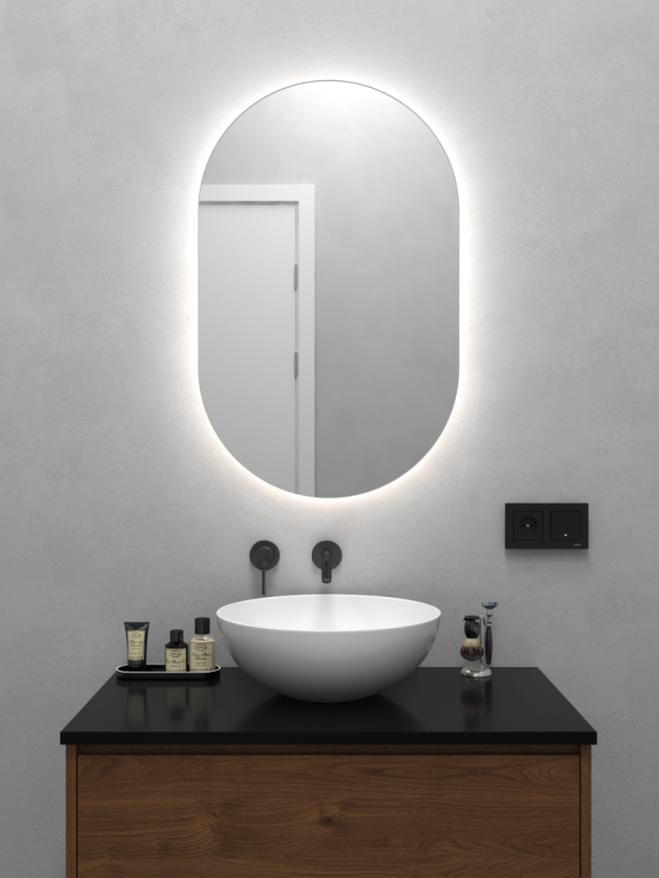 Безрамное зеркало овальной (капсульной) формы с контурной (тыльной) нейтральной подсветкой, свет 4000К. Подложка из высококачественного МДФ, светодиодная лента защищена матовым свето-рассеивателем от попадания пыли и влаги. Есть вывод 220W для подключения к сети, включение подсветки от выключателя на стене, либо от розетки.